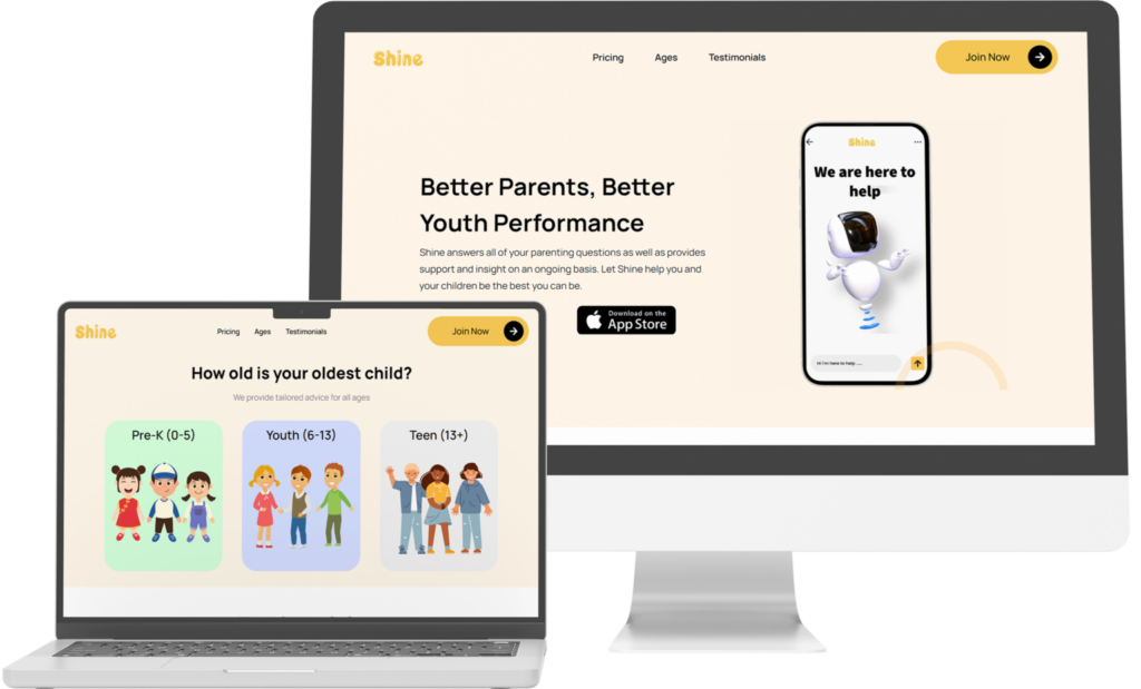Shine provides personalized parenting advice tailored to the age of the user’s children. The landing page allows users to select from different age groups: Pre-K (0-5), Youth (6-13), and Teen (13+), ensuring that the content and support provided are relevant to their specific needs.